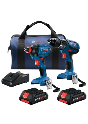 The Bosch 2-Tool Combo Kit with two CORE18V next-gen Li-ion 21700 cell technology features two tools designed to deliver professional cordless drilling and driving performance. The GXL18V-239B25 kit features two CORE18V batteries that provide next-gen Li-ion 21700 cell technology in lightweight, high-power batteries with all-day performance. It includes a GDX18V-1600 Freak Bit/Socket Impact Driver that has a two-in-one chuck that offers a 1/4 In. quick-change hex shank with power groove for bits, and a 1/2 In. square drive for sockets. Its motor produces up to 1,600 In.-Lbs. of torque and up to 0-3,600 impacts per minute. The HDS181A Compact Tough 1/2 In. Hammer Drill/Driver has an upgraded metal chuck, and its motor delivers the same power as conventional 18V motors in a more compact size. It produces 600 In.-Lbs. of torque, up to 27,000 bpm in hammer mode and two drilling speeds (0-1,900 rpm for high speed and 0-500 rpm for high power). The kit includes an 18V charger to get the user back to work fast, and it has two longer belt clips that provide a more secure hold.