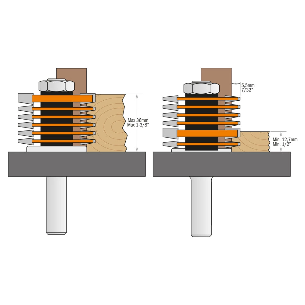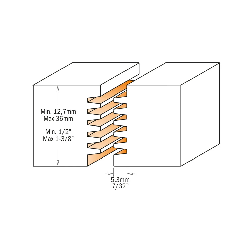Make an incredibly strong side-to-side or end-to-end joint in wood and wood composites. The tightness of the accurately cut joint and the maximum glue surface create a joint that is actually stronger than the wood itself. The bit features two flute design, carbide teeth and six removable cutters. This bit features super-strength superior steel body, anti-kickback design to control the depth of cut, Non-Stick Orange Shield Coating and cutting edges made of SinterHip Hi-Density Industrial Chrome Carbide for a long-lasting performance. After a test performed by Wood Magazine, CMT orange bits have been rated the first overall router bits compared to other brands.