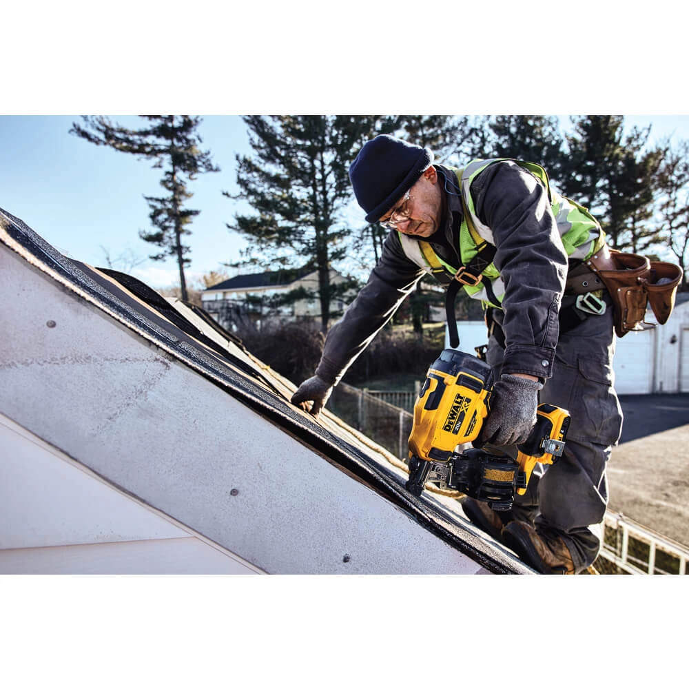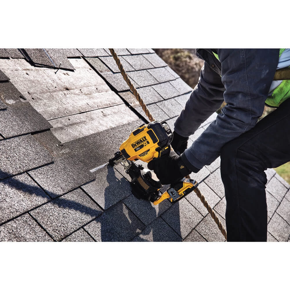 This Dewalt DCN45RNB 20V MAX* 15° Cordless Coil Roofing Nailer delivers cordless convenience ideal for service repairs and small jobs. There are absolutely no hoses, compressors, or gas cartridges required. It’s 100% battery-powered so the pro can show up and get to work right away. The 20V MAX* 15° Coil Roofing Nailer can drive the full range of roofing fasteners from 3/4 in. to 1-3/4 in. Get the job done quickly and efficiently with bump actuation mode and tool-free depth adjustment that provides precise nail placement.