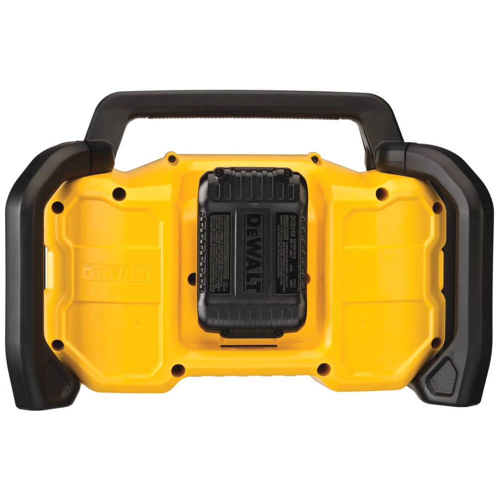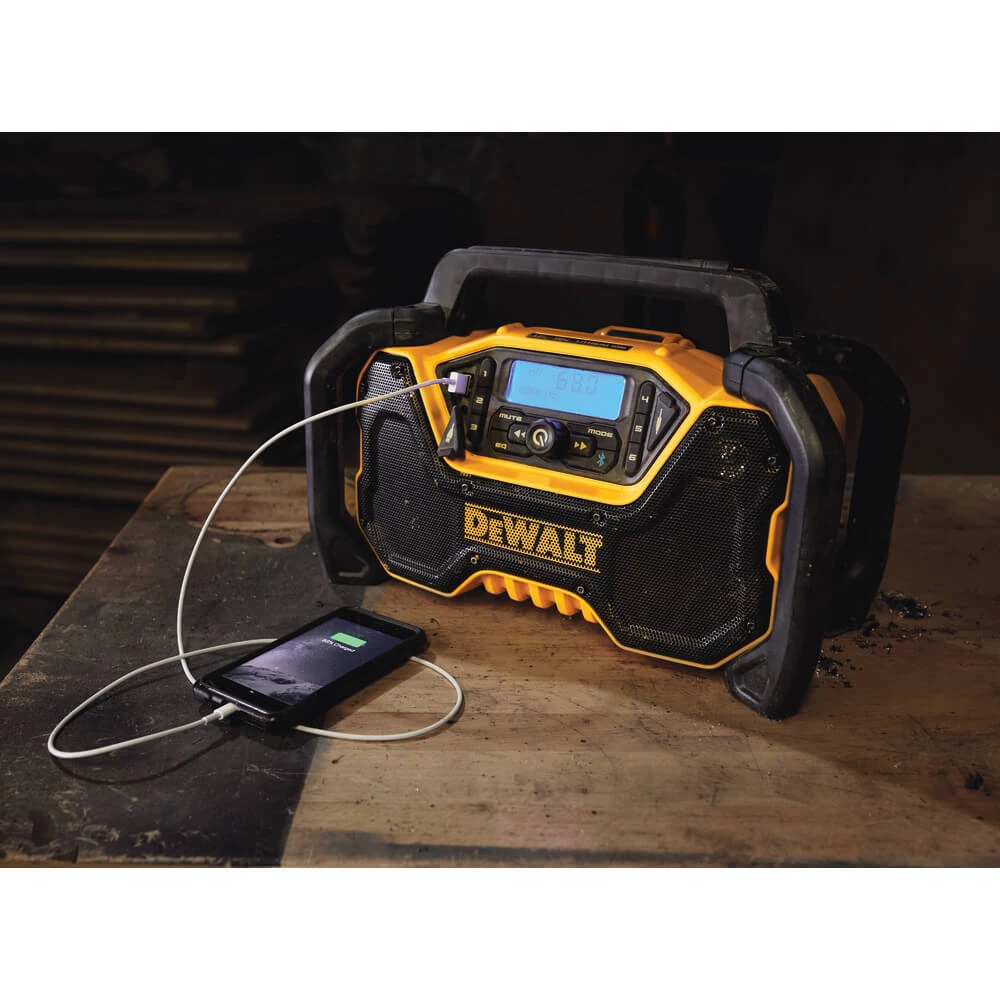 The 12V/20V MAX* Bluetooth Jobsite Radio provides premium sound in the toughest work environments. Its durable roll-cage design withstands drops and impacts. The innovative handle stores and protects the radio antenna when not in use. Quad speakers kick out true stereo sound with deep bass. Stream music via Bluetooth from up to 100 feet, or connect through the built-in auxiliary port. AM/FM radio includes six customizable presets per band. A convenient USB port charges your mobile devices. This cordless jobsite radio includes a detachable AC power cord, or power with DEWALT® 12V MAX*, 20V MAX*, or FLEXVOLT® batteries (sold separately). The Bluetooth Jobsite Radio includes a 3-year limited warranty.