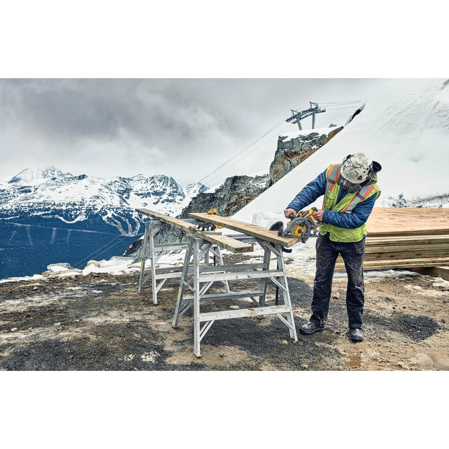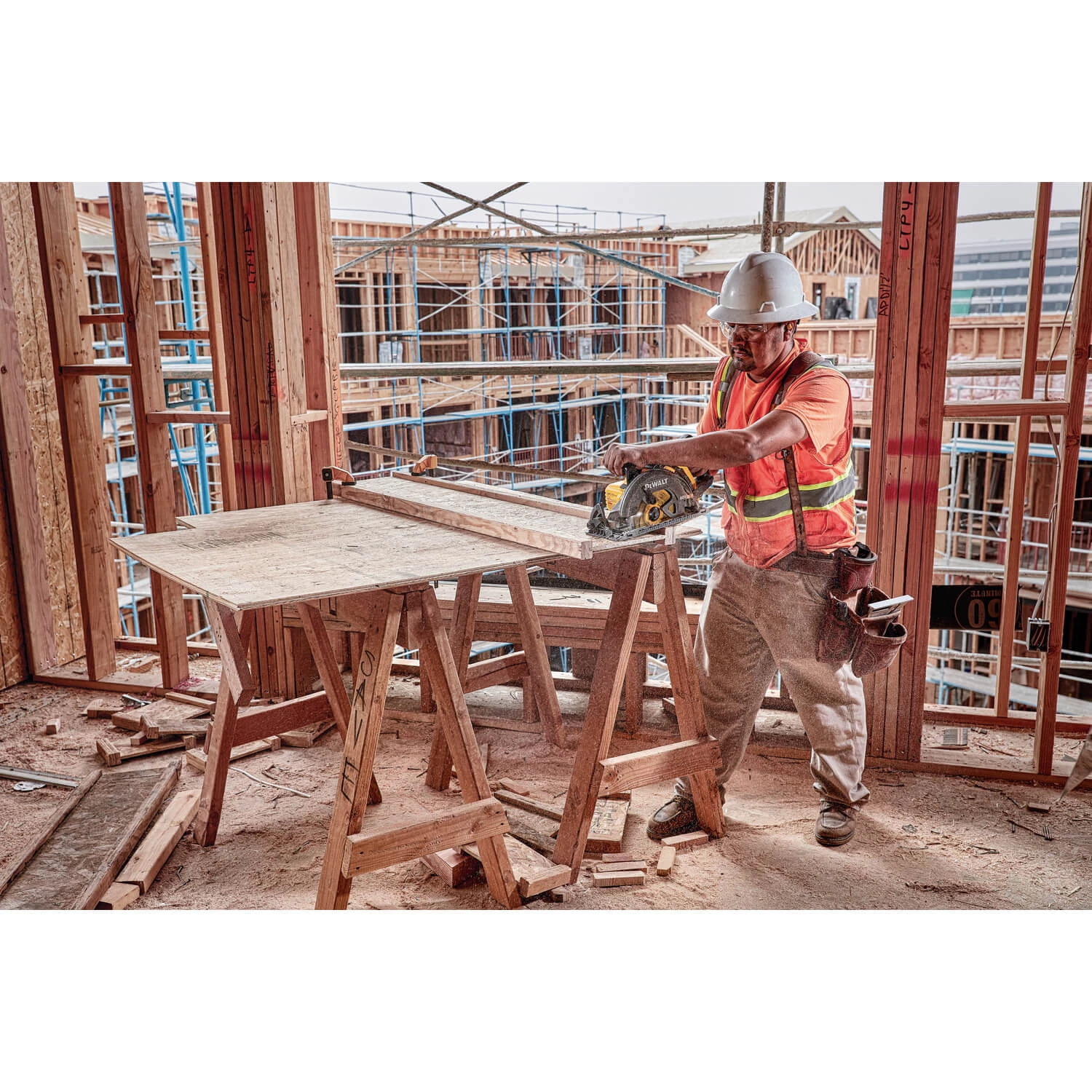 The 60V MAX* 7-1/4 in. Cordless Worm Drive Style Saw with 9.0 Ah battery offers big runtime. The blade is oriented to the left of the motor and the handle is at the rear to optimize line of sight when cutting. An electronic brake helps stop the blade after the trigger is released. Bevel capacity is 53° with stops at 45° and 22.5°. The saw makes smooth, accurate cuts and delivers long runtime with a durable, high-grade magnesium shoe and an efficient brushless motor. This Cordless Worm Drive Style Saw cuts to a depth of 2-7/16 in. at 90°. The included rafter hook makes it convenient to hang the tool on the jobsite. It’s ideal for wood cutting applications such as oriented strand board (OSB), plywood, hardwoods, dimensional lumber, and flooring. Professional framers, concrete formers, carpenters, and general contractors can boost their productivity with this tool. Available where DEWALT products are sold in fall 2017, all DEWALT high powered cordless tools will come standard with a 3-year limited warranty, 1-year free service contract and 90-day money-back guarantee.