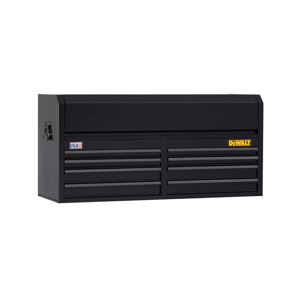 This 52-inch wide 8-Drawer Tool Chest is constructed of double-wall steel for strength and durability. It has eight 100-pound load capacity drawers with full-extension ball-bearing drawer slides and soft close latching for smooth and quiet operation. It also has a heavy-duty keyed internal locking system to safeguard tools. Conveniently charge your power tools, batteries, and electronics in the under-lid area with gas struts to provide access with easy opening and closing. Also included are eight DEWALT embossed drawer liners and one DEWALT embossed top mat. Recommended with this unit is our 700 Series 52-inch wide 9-Drawer Rolling Tool Cabinet (DWST25292), sold separately. Look no further than our Metal Tool Storage line for your tool storage and organization needs. Choose from a variety of sizes in top tool chests and rolling tool cabinets, all of which are made of 18-20 gauge steel. All units have an 18-inch depth to fit our mechanic tools sets, and other hand tools and accessories.