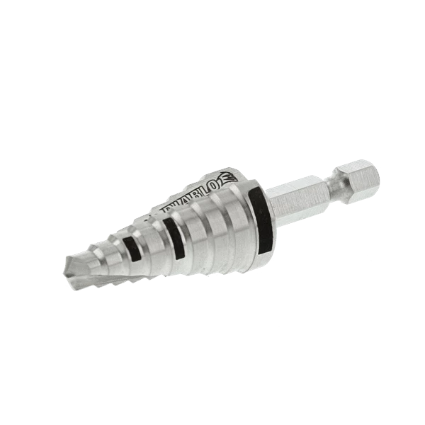 Diablo’s new Step Drill Bits bring exclusive technology to the Electrician, Plumber and HVAC contractor with fast, accurate cuts and increased stability in thin metals, PVC other plastic materials. The innovative Split Point Tip design enables a fast, on-point start resulting in increased durability and up to 4X longer life. An automated precision grinding process on each step reduces wear and delivers 2X faster cuts. Multiple hole sizes are made easy with laser etched step markings while increased step heights for common hole sizes makes drilling holes more efficient and faster. Designed with a ¼” hex shank, these bits are impact ready and can be used with drills and impact drivers.