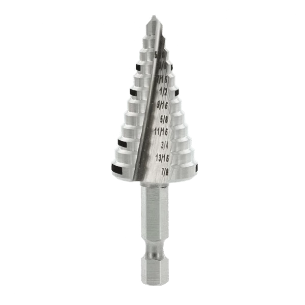 Diablo’s new Step Drill Bits bring exclusive technology to the Electrician, Plumber and HVAC contractor with fast, accurate cuts and increased stability in thin metals, PVC other plastic materials. The innovative Split Point Tip design enables a fast, on-point start resulting in increased durability and up to 4X longer life. An automated precision grinding process on each step reduces wear and delivers 2X faster cuts. Multiple hole sizes are made easy with laser etched step markings while increased step heights for common hole sizes makes drilling holes more efficient and faster. Designed with a ¼” hex shank, these bits are impact ready and can be used with drills and impact drivers.