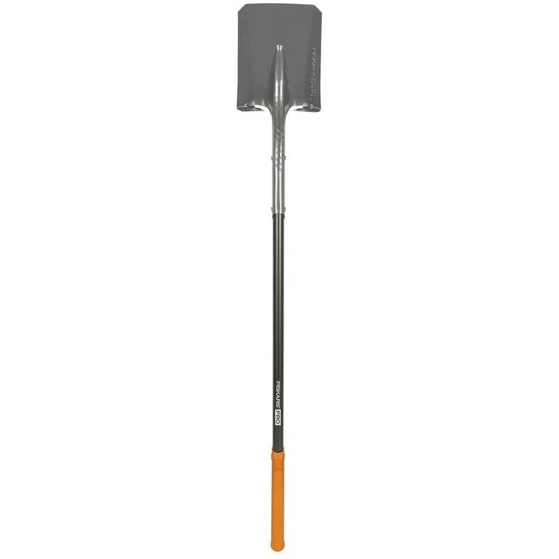 - The Fiskars 397910 Pro Transfer Shovel with Extruded Aluminum Handle, Double-Bolted Extended Shank, and Ergonomic Teardrop Shaped Shaft