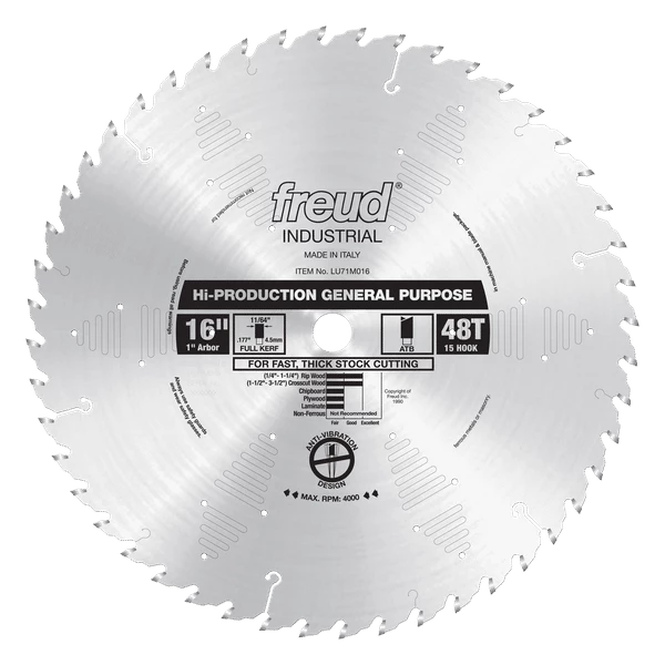 This highly aggressive general purpose blade is ideal for a production environment. With its low number of teeth and steep hook angle, this blade can operate at high feed rates. These features also make it the blade of choice when crosscutting extremely thick stock. Use it with dimension stock where speed is more important than surface quality. The ideal working range is from 1/4″ to 1-1/4″ thick for ripping and 1-1/2″ to 3-1/2″ thick for crosscutting. Thicker or thinner material may be cut, but some loss of surface finish may occur.