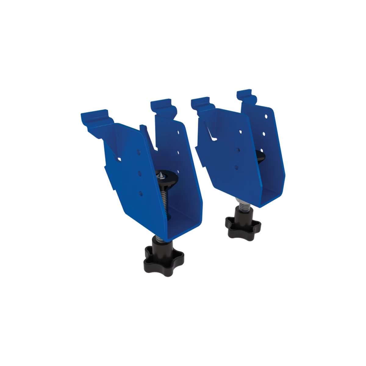 Made from thick steel, the Project Table Expansions Brackets are adjustable to position the 2x4s in two ways: flush with the surface of the Project table, of 3/4″ below the surface, which allows for adding a plywood surface to the enlarged table. Holes in the sides of the brackets allow driving the included screws into the 2x4s to hold them in place in the brackets.