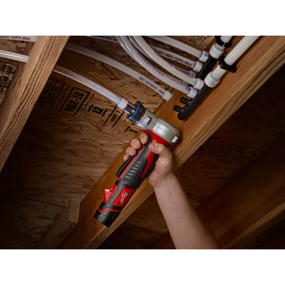 The M12™ Cordless LITHIUM-ION ProPEX® Expansion Tool features an auto-rotating head for convenient one-handed operation. A compact right angle design makes installing tubing in tight locations fast and easy, and the quick cam mechanism delivers precise, continuous expansion for 3/8” to 1” ProPEX connections. Designed specifically for Uponor ProPEX, the M12™ Cordless LITHIUM-ION ProPEX® Expansion Tool is built to make effortless installations faster than other tools available.