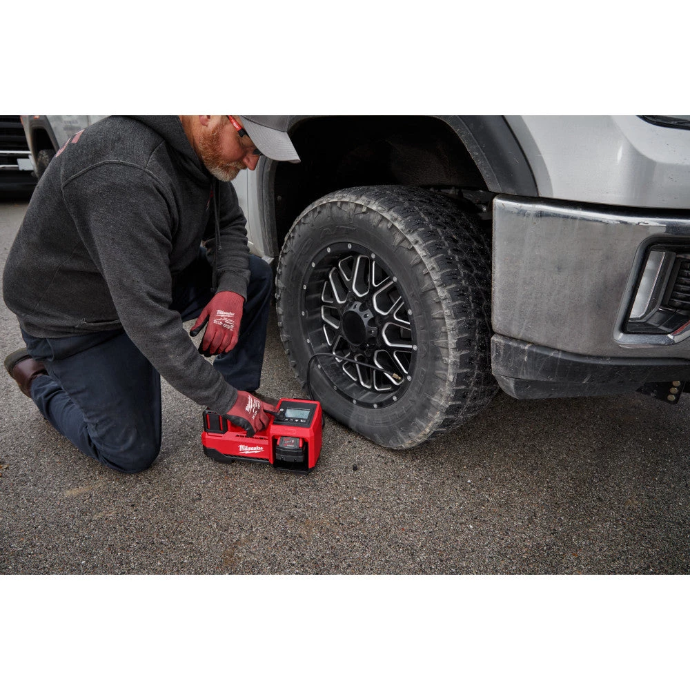Our FASTEST 18V CORDLESS TIRE INFLATOR. The M18™ Inflator delivers fast, accurate, easy inflation with the portability to take anywhere. Optimized for passenger, light truck, and other medium-duty tires. Rated to deliver max 150PSI, the high efficiency motor tops-off 33” light truck tires in under 1 minute. The TrueFill™ Technology features an auto-pressure check that is designed to WAIT for the pressure to stabilize, CHECK the system pressure, and FILL until the desired target is reached. In addition, an Auto Shut-Off feature will stop inflation at selected PSI to prevent overinflation allowing users to set it & forget it. Furthermore, the unit includes 4 PSI memory slots, anti-vibration feet, a 36” inch hose with an all-brass Schrader chuck, and an on-board hose and nozzle storage.​