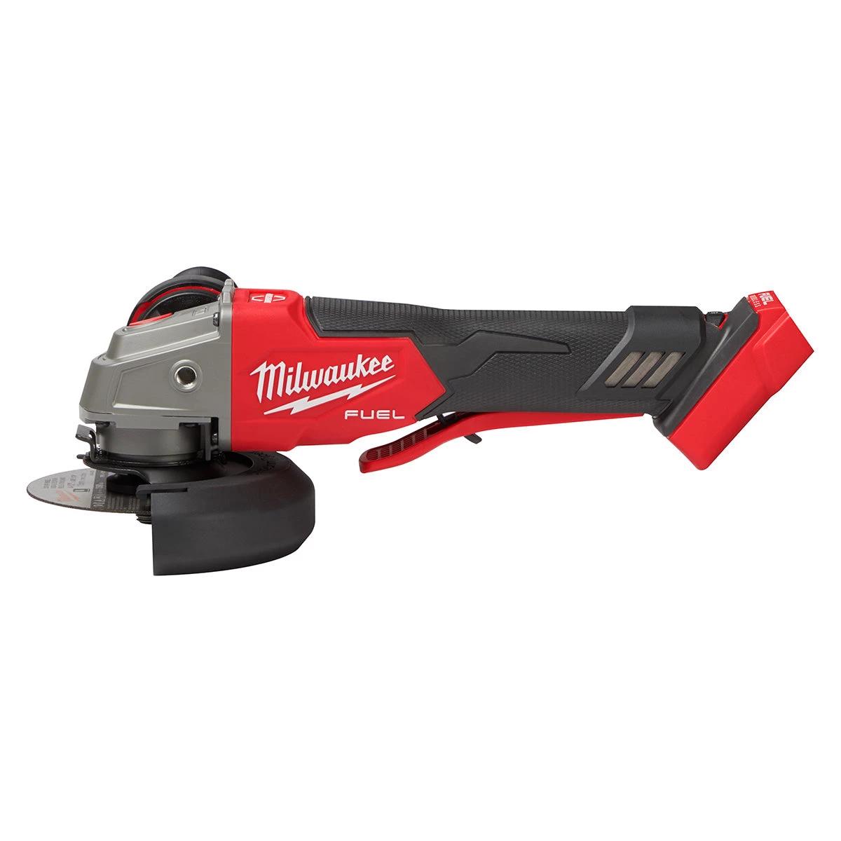 Our M18 FUEL™ 4-1/2″ / 5″ Variable Speed Braking Angle Grinder, Paddle Switch No-Lock is the newest addition to Milwaukee’s battery-powered grinder lineup, generating 11A Corded Power, 5 Speed for Increased Control, and RAPIDSTOP™ Brake for Enhanced Safety. The POWERSTATE™ Brushless Motor delivers 3,500- 8,500 RPM and maximum sustained power to complete the toughest grinding and cutting applications, allowing you to push your cordless angle grinders harder and longer than ever before. REDLINK PLUS™ Intelligence ensures unmated levels of performance, protection, and compatibility. The M18™ REDLITHIUM™ HIGH OUTPUT™ XC6.0 Batteries (not included) deliver 50% more power while running 50% cooler than our M18™ REDLITHIUM™ XC Batteries. The Variable Speed dial provides 5-speed settings between 3,500 RPM and 8,500 RPM allowing for greater control in more applications. With tool-free accessory and guard adjustments, users will experience faster accessory changes and less downtime. The MILWAUKEE® M18 FUEL™ 4-1/2″ / 5″ Variable Speed Angle Grinder takes cordless tools to the next level in performance, run-time, and application versatility.