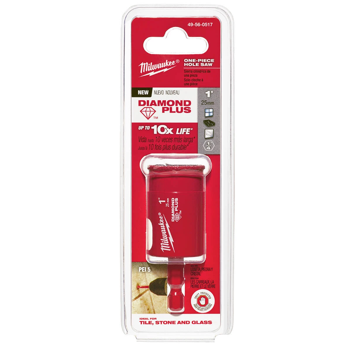 Choose the Milwaukee® Diamond Plus™ Hole Saw for up to 10X longer life when cutting tile, stone and glass. Diamond Plus™ Hole Saws deliver best-in-class performance, with higher grade diamonds for maximum heat and fracture resistance. An improved braze provides superior diamond retention when cutting hard, abrasive materials. The One-Piece Hole Saw has a 1/4″ quick change hex shank and features a large slug ejection slot. Designed as the single cutting solution for all tile, stone, and glass applications, Diamond Plus™ offers the lowest cost-per-hole on the market.