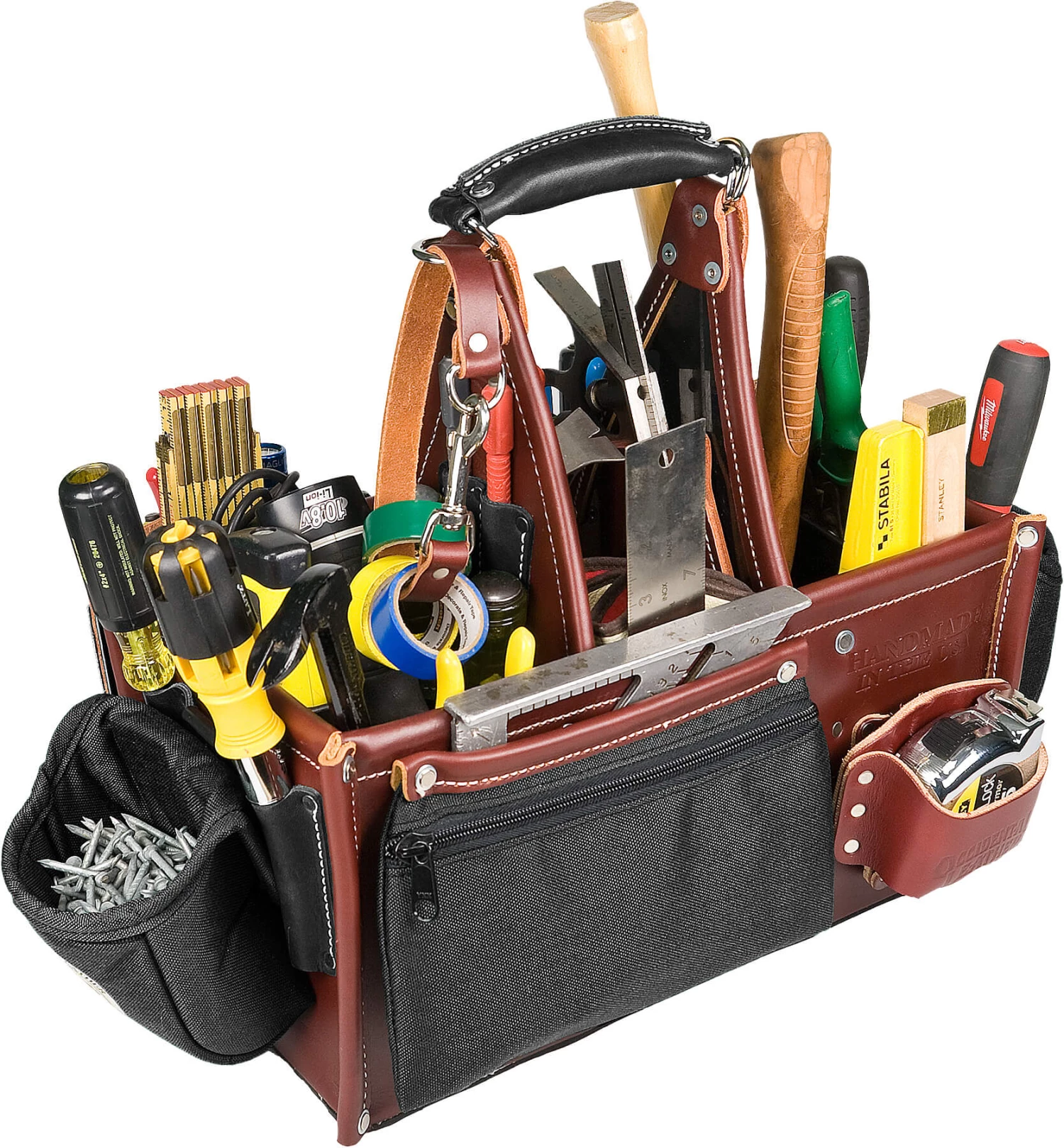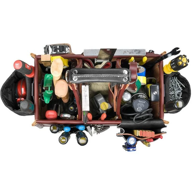 An industrial work of art. Handcrafted leather handle “molds” to your grip. This eight by fourteen inch tool carrier features 3 compartments with 45 pockets and tool holders. Innovative upright storage for quick access.
