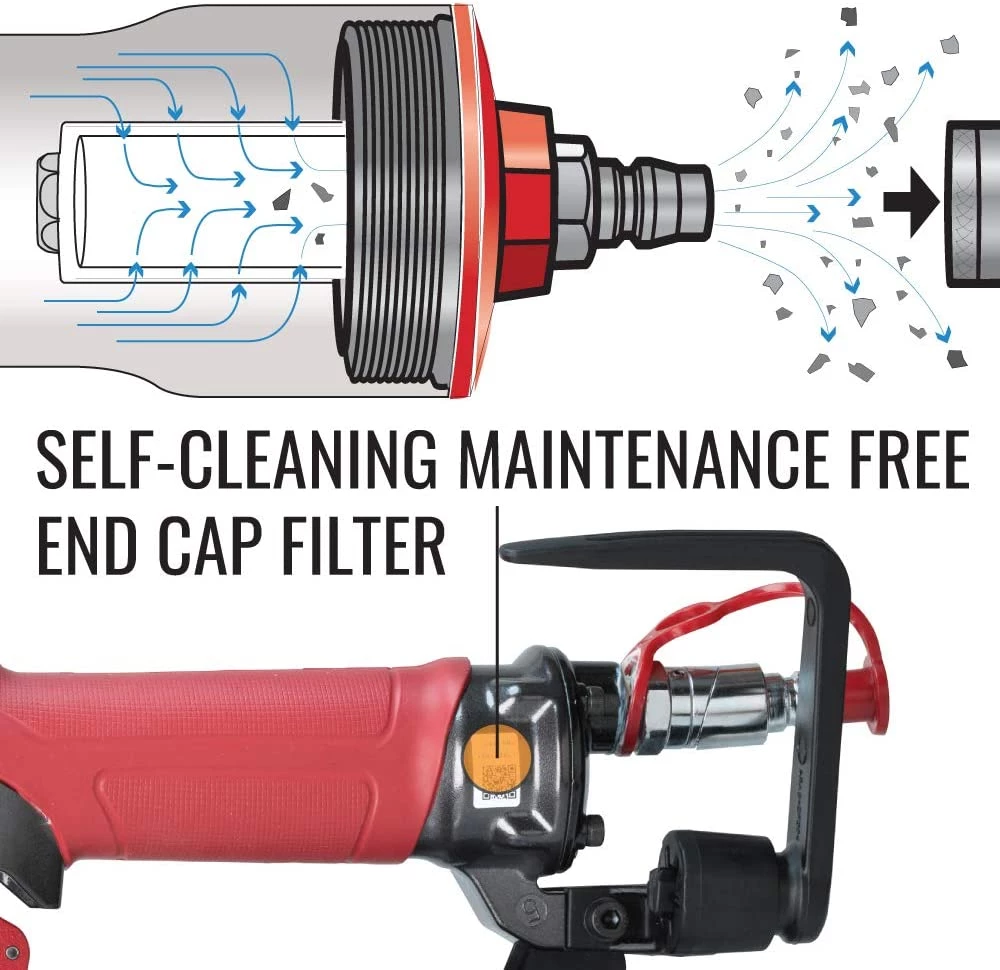 The patented, self-cleaning maintenance free end cap filter captures foreign substances before they can enter the tool and automatically ejects them when the air hose is disconnected. - AVOID TRIP HAZARDS