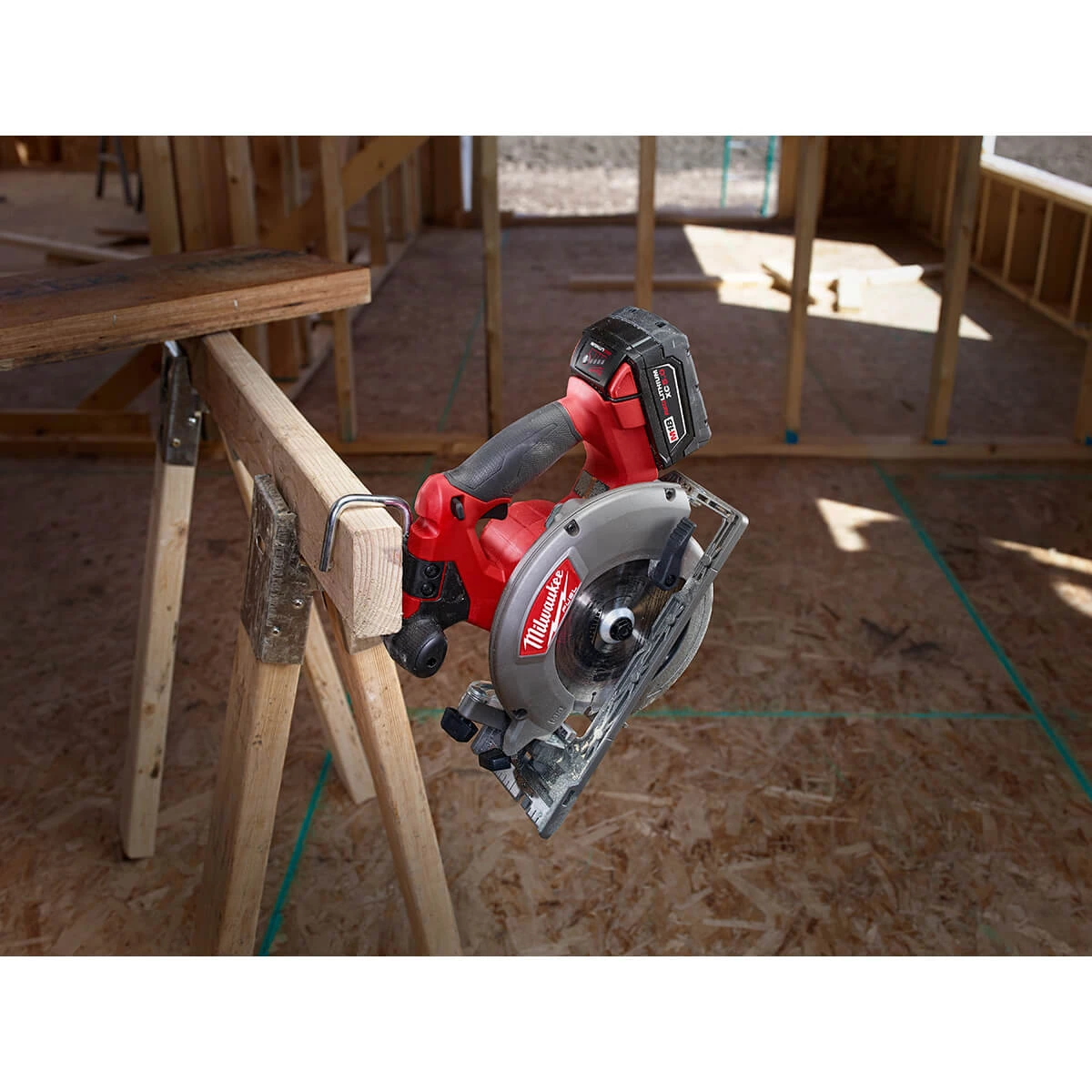 The M18 FUEL™ 6-1/2” Circular Saw Kit features the fastest saw in its class, offering up to 30% faster cutting, 2X more runtime and 3X longer tool life than competitive saws. The POWERSTATE™ Brushless Motor outpowers all other 18-Volt cordless circular saws and allows you to perform jobs that previously required a corded tool. The M18™ REDLITHIUM™ XC5.0 Extended Capacity Battery Pack delivers up to 2.5X more runtime and provides more work per charge and more work over the life of the pack than competitive batteries. The saw’s REDLINK PLUS™ Intelligence ensures optimized performance and protection from overloading, overheating and over-discharging. The 18-volt lithium-ion circular saw’s guards and shoe are built of cast magnesium to provide a durable, lightweight base. The saw also features an integrated LED light and a rafter hook for convenient storage on the job. The kit includes 2 M18™ REDLITHIUM™ XC5.0 Extended Capacity Battery Packs, a multi-voltage charger, a carrying case, a blade wrench and blade.