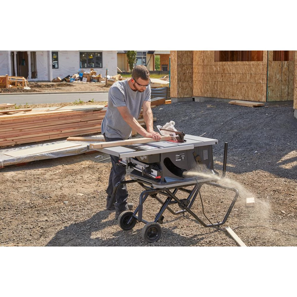 The 1.5 HP, 15 Amp SawStop Jobsite Saw Pro is the standard in jobsite safety. Equipped with SawStop’s patented blade braking technology, this saw delivers unmatched protection coupled with groundbreaking functionality. With the 1 Turn Elevation and Quick tilt features, users can raise and lower the blade with just 1 turn of the handwheel and quickly tilt the blade for bevel cuts saving valuable time. The solid T-Style Fence with Ergolock allows the fence to slide smoothly along the rails and locks in tight for accurate cuts. Simple, intuitive action extends the Mobile Cart for use and collapse the cart for transport and storage. This saw includes 1 standard brake cartridge, 1 40-tooth blade, 1 zero clearance insert, a collapsible rolling cart, active dust collection blade guard and riving knife. Experience the precision, quality and safety of a SawStop saw wherever your jobs will take you.