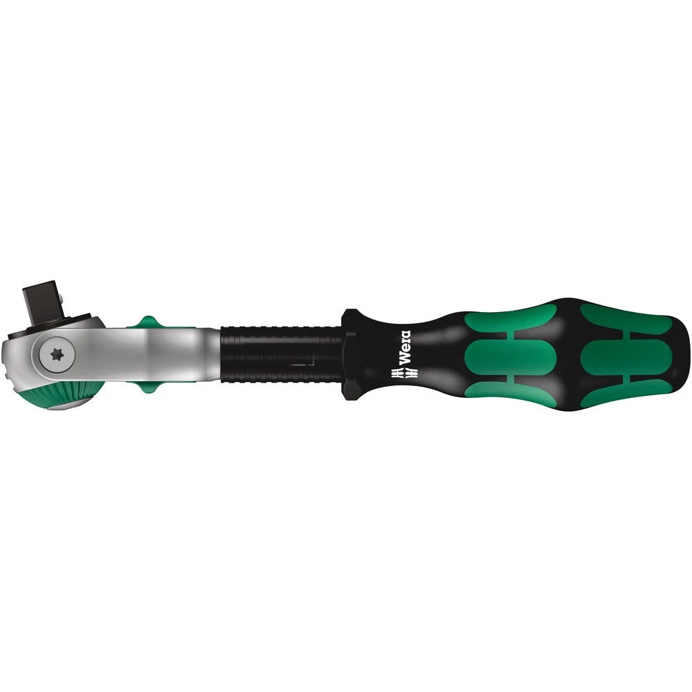 Zyklop ratchet with 3/8″drive. The 72 fine-pitched teeth enable a low return angle of only 5°. The ratchet head pivots freely and can be locked into any position by using the slide switch that is positioned on either side. It is even possible to work conveniently in very confined and difficult-to-access areas with enhanced hand clearance. The predefined locking positions at 0°, 15° und 90°, both to the right and left, ensure safe working without any slipping of the ratchet head. The ratchet can be used as a conventional screwdriver in the 0° position by attaching an adaptor and a bit. The flywheel design ensures rapid screwdriving. The rotation-symmetric construction of the Kraftform handle and the free-turning sleeve support rapid twisting. The outstanding design of the Kraftform handle fits perfectly into the hand preventing hand injuries such as blisters and calluses. The hard materials used for the handle ensure quick and easy hand repositioning without any danger of the skin “sticking” to the handle. The softer anti-slip zones enable the low-loss transfer of high torque. For 3/8″ square sockets as well as 3/8″ adaptors with square drive, equipped with ball lock.