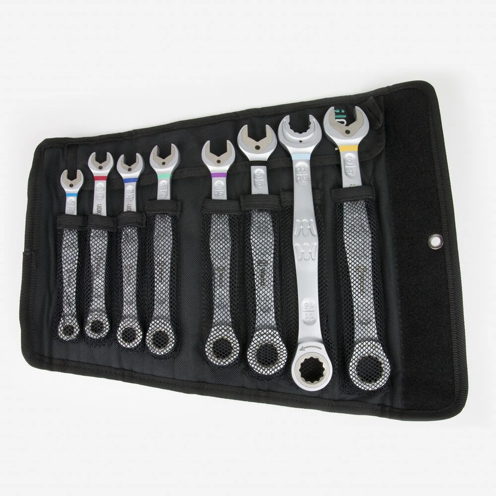 High quality combination ratchet wrench set by Wera: everything that a wrench has to be able to do. And a whole lot more. Faster, better, stylish. Yes, a real Joker. The new generation of combination ratchet wrenches. 8-piece set with imperial sizes in a robust pouch. Suitable for hexagon bolt heads or nuts. Comes with a holding function, thanks to the metal plate in the jaw, which reduces the risk of dropping nuts and bolts. The replaceable metal plate in the jaw secures nuts and bolts with its extra hard teeth and limits the danger of slipping. The integrated limit stop prevents any slipping down around the bolt head and allows higher torque to be applied. The double-hex geometry makes for a positive connection with nuts or bolts and reduces the risk of slipping. A return angle of only 30° at the open end prevents any time consuming flipping of the wrench during fastening jobs. The ratchet mechanism at the ring end, with an exceptional, fine-tooth mechanism – 80 teeth in all – enables flexibility even in very confined working spaces. The specially forged geometry provides for high torque transfer and strength. Manufactured out of high performance chrome molybdenum steel with a nickel-chrome coating for high corrosion protection. “Take it easy” Tool Finder with colour coding according to sizes.